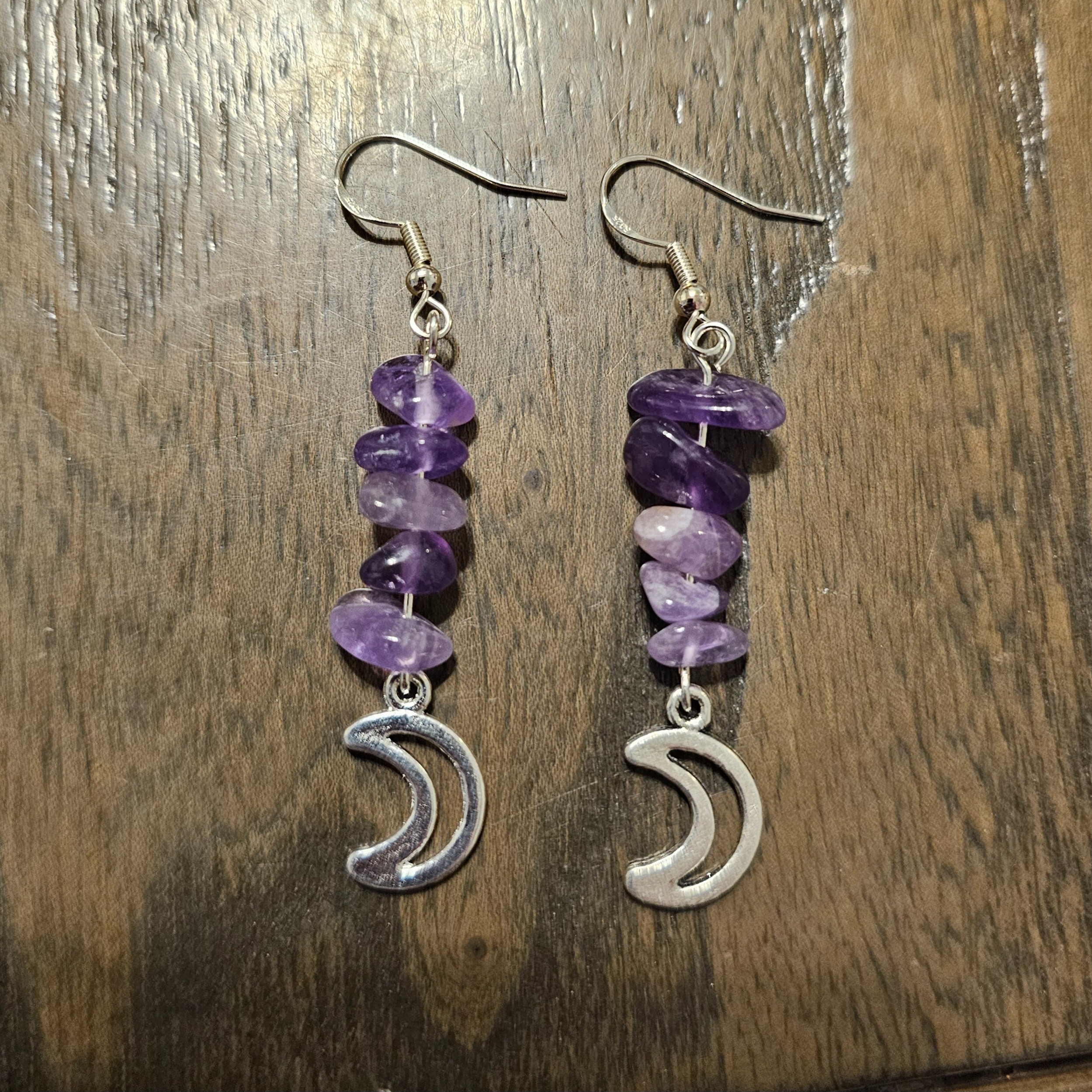These zinc alloy moon charms topped with natural amethyst chips are attached to 925 sterling silver fish hook style earrings.