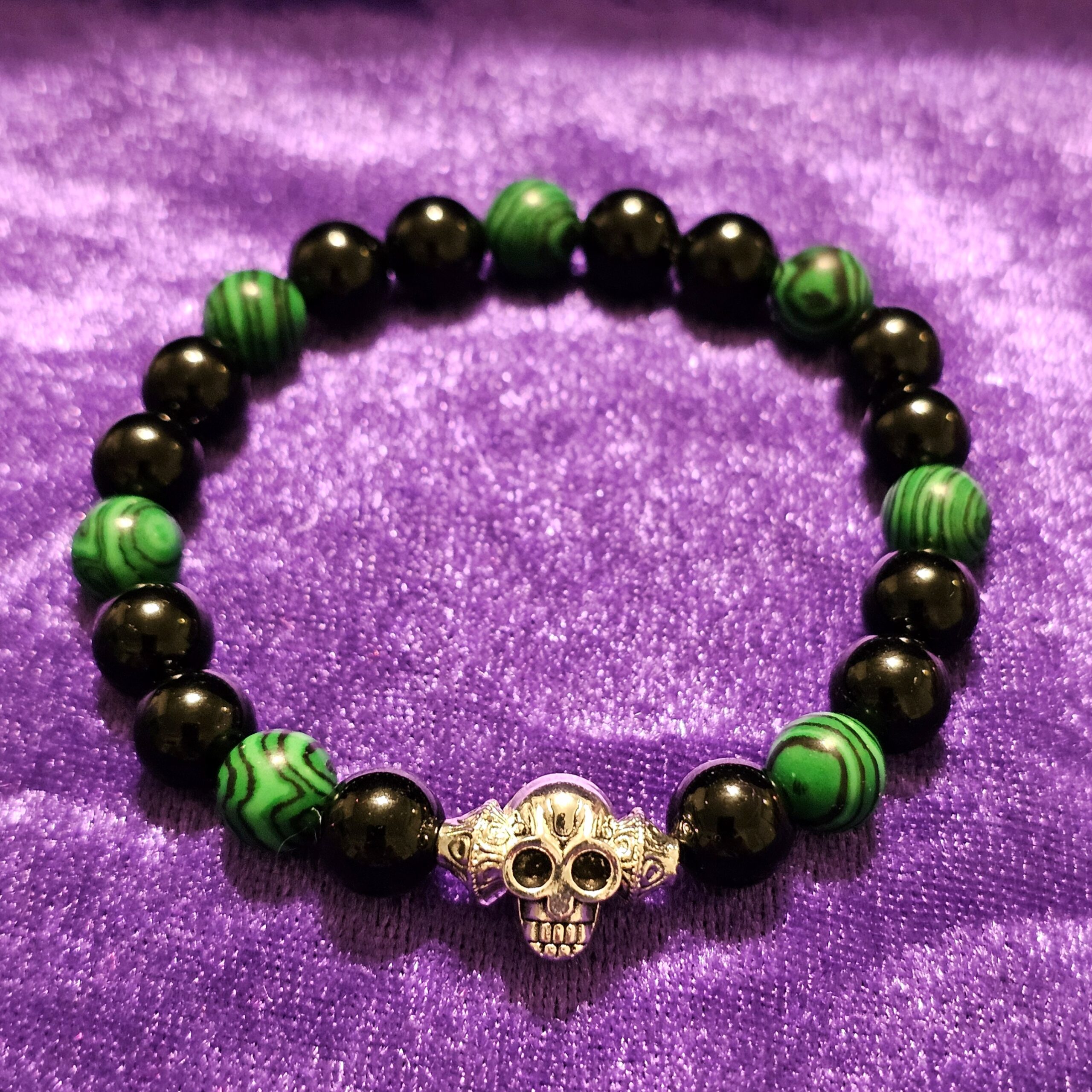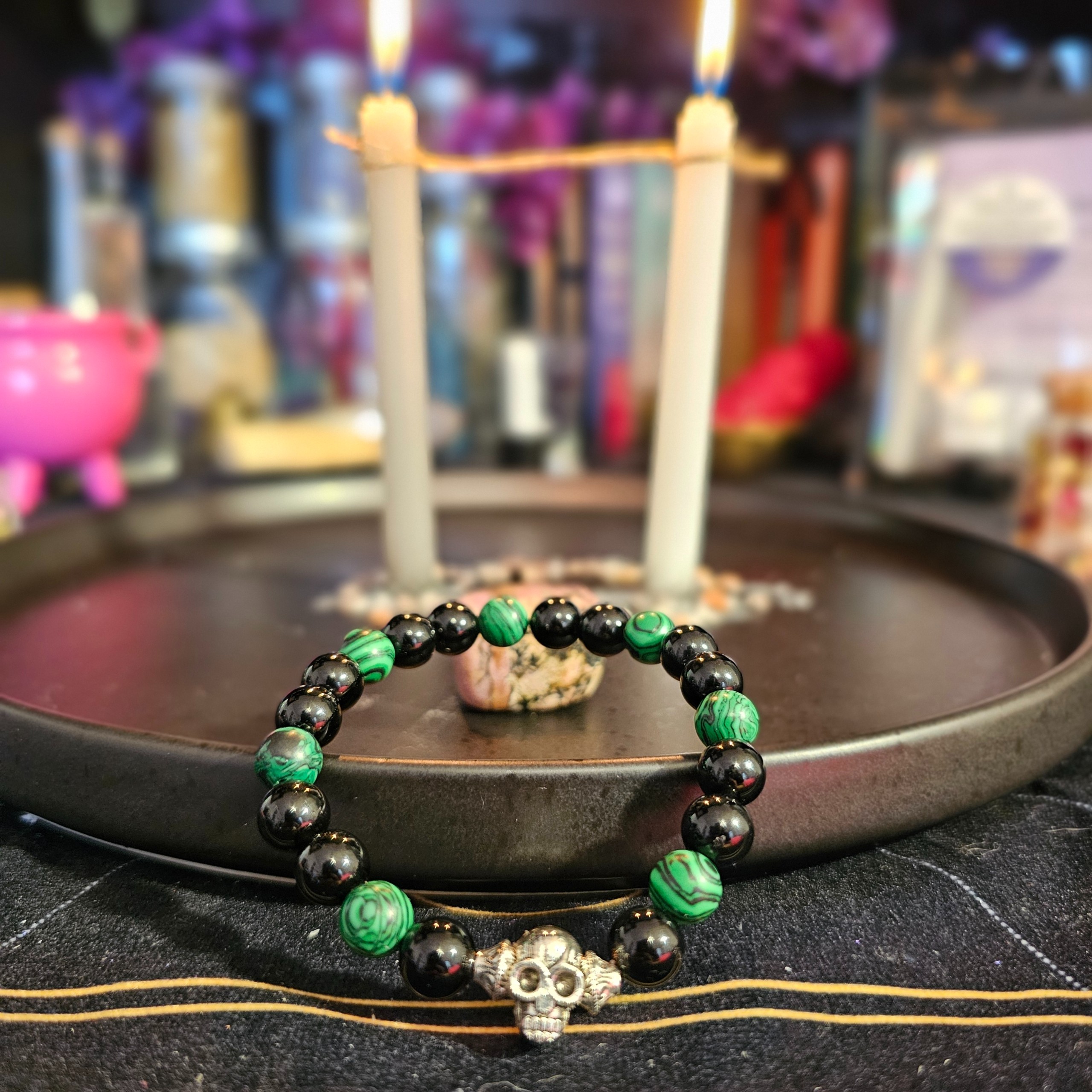 Crafted with obsidian and reconstituted malachite, this bracelet is designed to support releasing that which no longer serves you – ideal for cutting toxic people, old patterns, or bad habits out of your life. Obsidian helps to dispel negative energy while the diluted malachite brings a softer emotional release than the harsher release from full strength malachite.