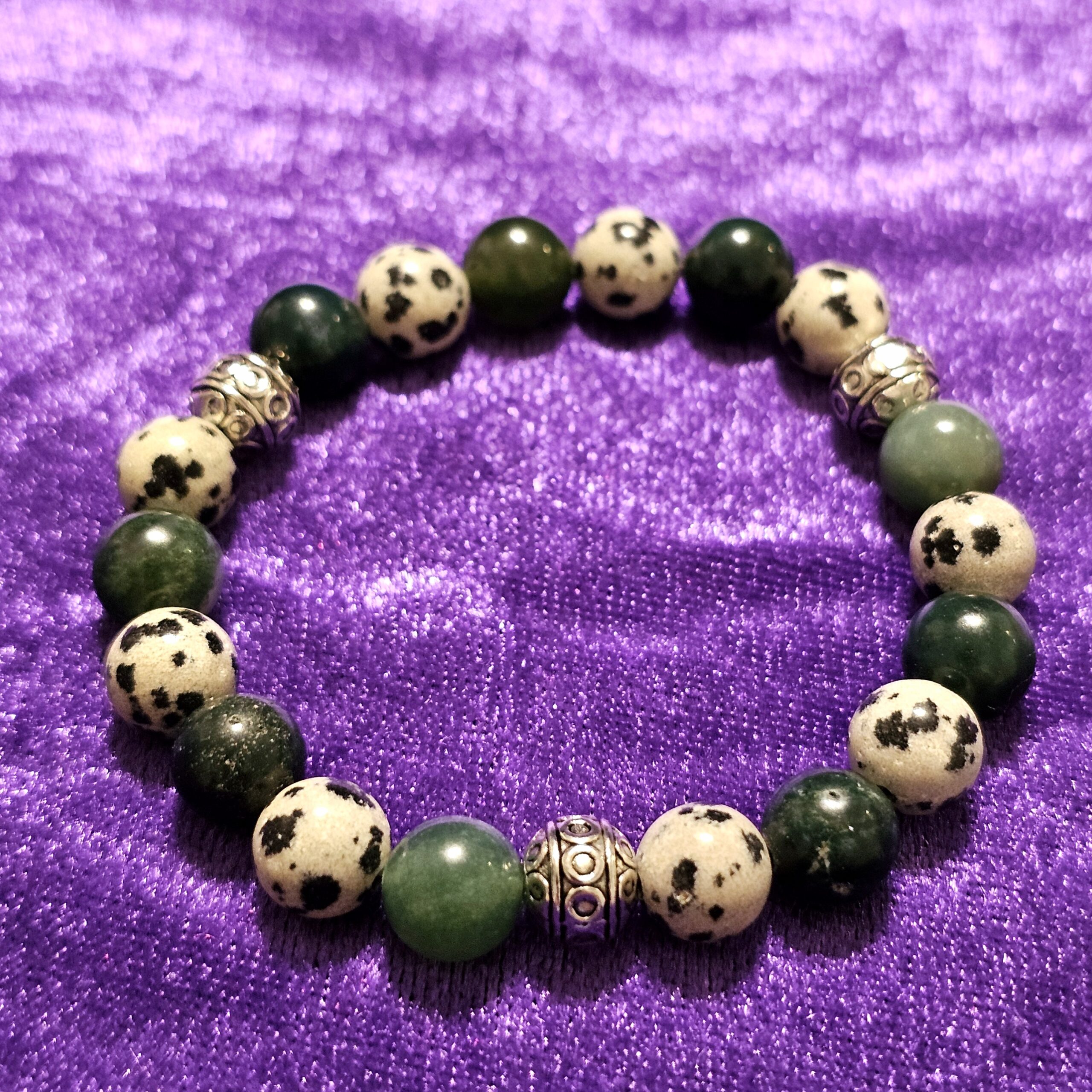 Dalmatian Stone and Moss Agate work together to bring a grounded yet joyful calm, emotional balance, and steady, earth-centered energy.