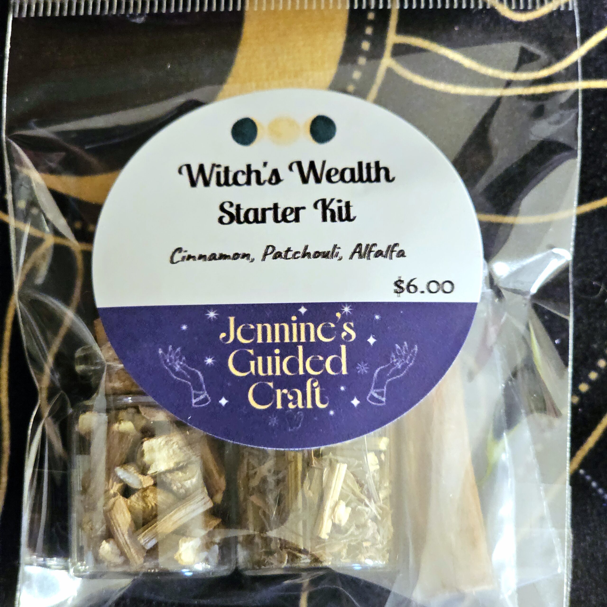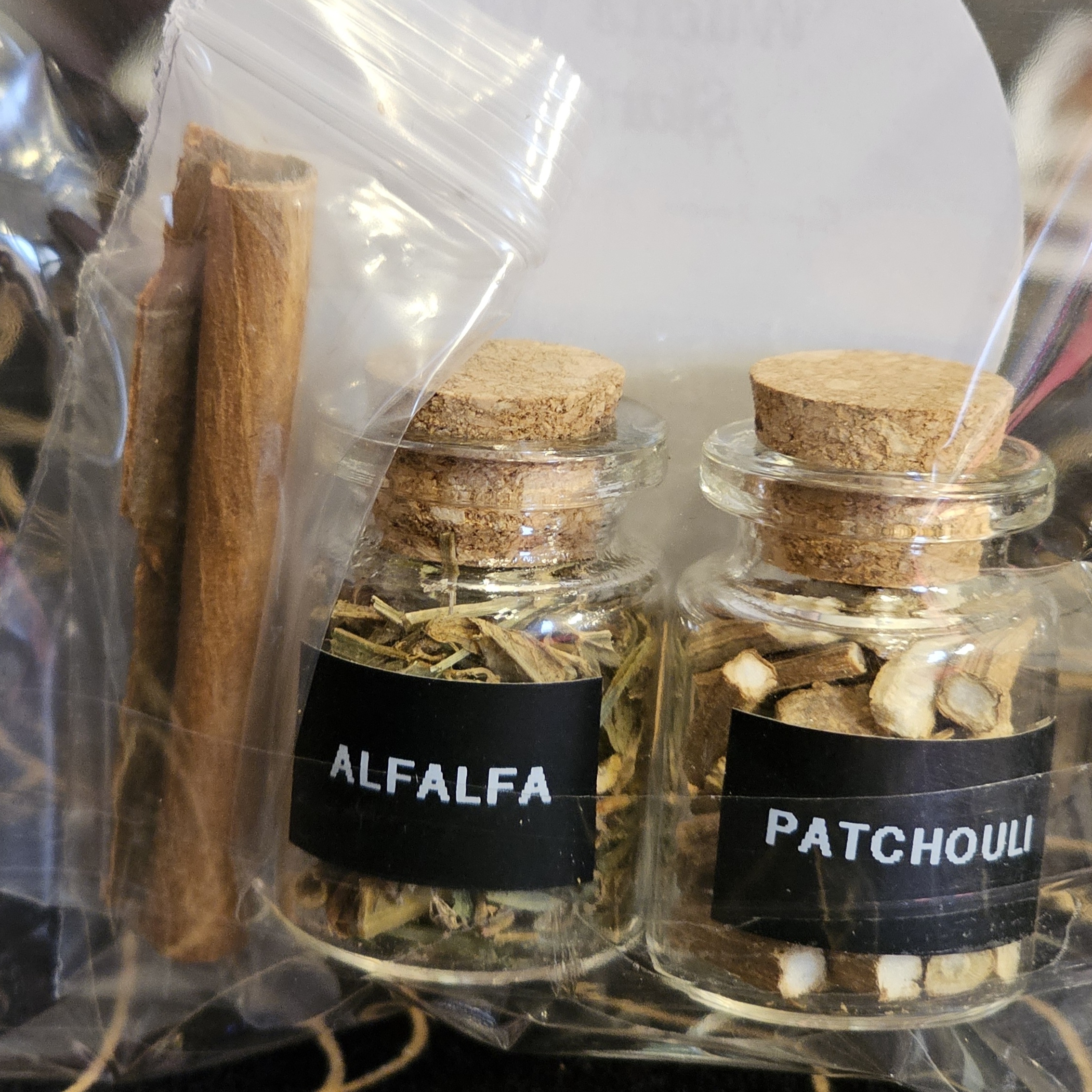 Designed with new witches in mind, this starter kit is useful for those wanting to explore new wealth/prosperity centered ingredients without committing to large quantities. Includes 1 bag with a cinnamon stick and two 30mm jars of Patchouli, and Alfalfa.